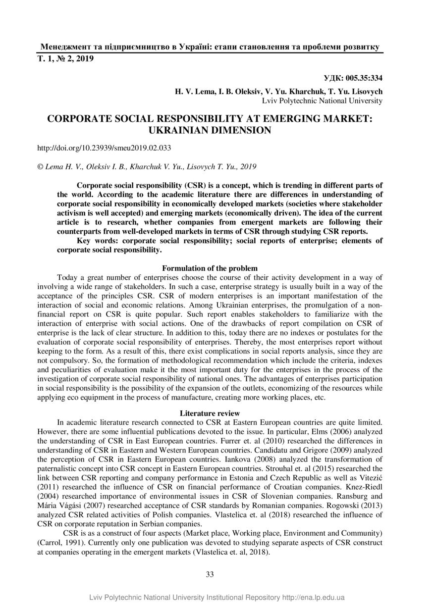 Corporate social responsibility at emerging market: ukrainian dimension / H. V. Lema, I. B. Oleksiv, V. Yu. Kharchuk, T. Yu. Lisovych // Менеджмент та підприємництво в Україні: етапи становлення та проблеми розвитку. — Львів : Видавництво Львівської політехніки, 2019. — Том 1. — № 2. — С. 33–42.