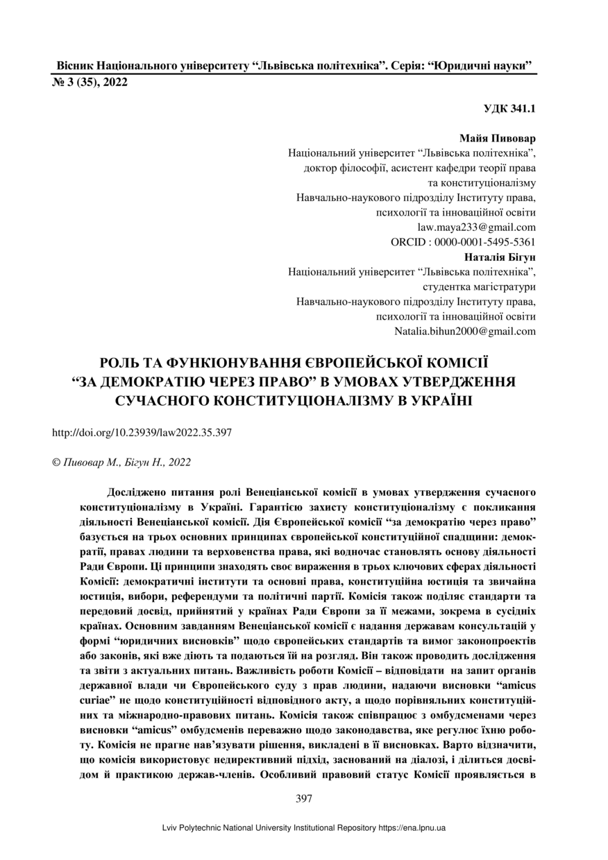 Пивовар М. Роль та функіонування європейської комісії “за демократію через право” в умовах утвердження сучасного конституціоналізму в Україні / Майя Пивовар, Наталія Бігун // Вісник Національного університету “Львівська політехніка”. Серія: “Юридичні науки”. — Львів : Видавництво Львівської політехніки, 2022. — Том 9. — № 3 (35). — С. 397–404.