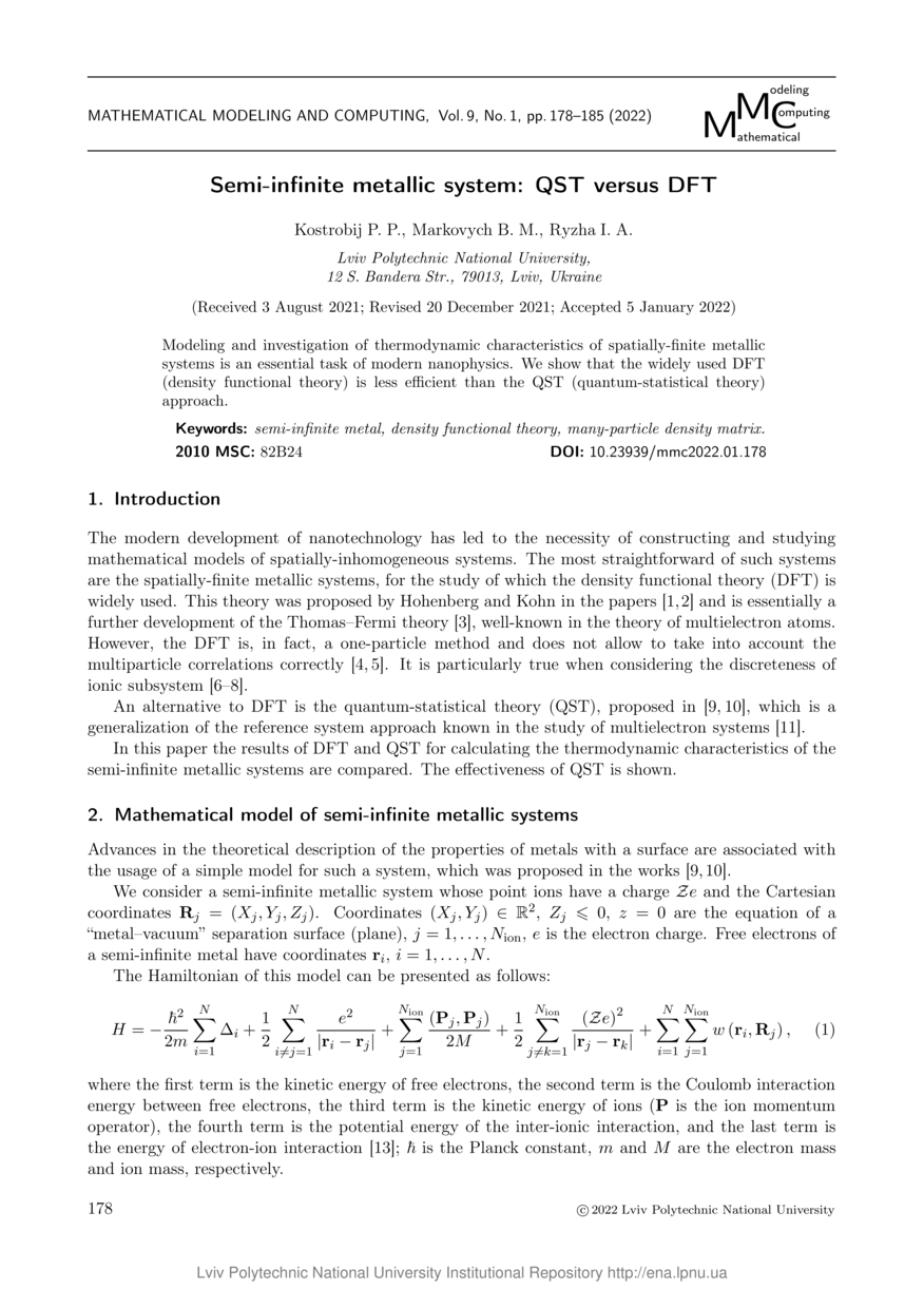 | dc.identifier.citationen | Kostrobij P. P. Semi-infinite metallic system: QST versus DFT / P. P. Kostrobij, B. M. Markovych, I. A. Ryzha // Mathematical Modeling and Computing. — Lviv : Lviv Politechnic Publishing House, 2022. — Vol 9. — No 1. — P. 178–185. | |