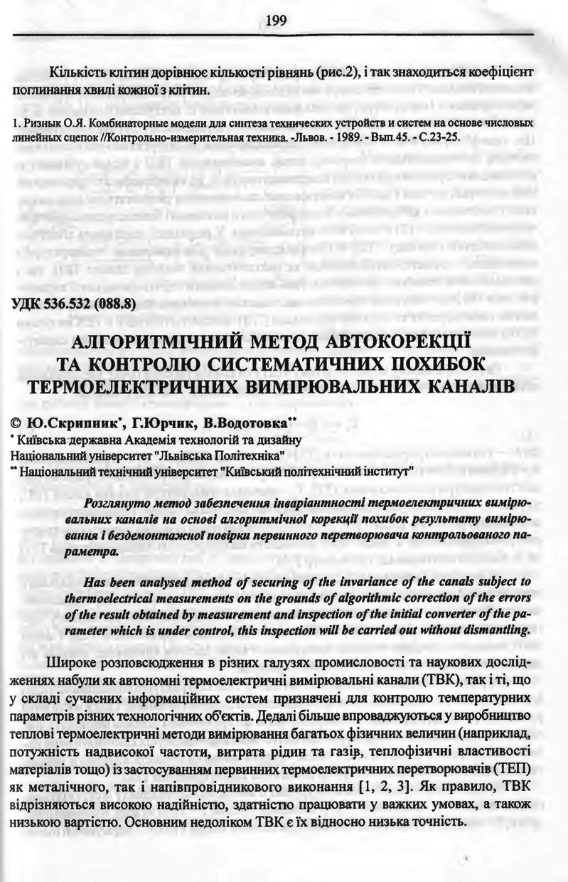 Скрипник Ю. Алгоритмічний метод автокорекції та контролю систематичних похибок термоелектричних вимірювальних каналів / Ю. Скрипник, Г. Юрчик, В. Водотовка // Вісник Національного університету “Львівська політехніка”. — Львів : Видавництво Національного університету “Львівська політехніка”, 2002. — № 450 : Комп'ютерна інженерія та інформаційні технології. — С. 199–205.
