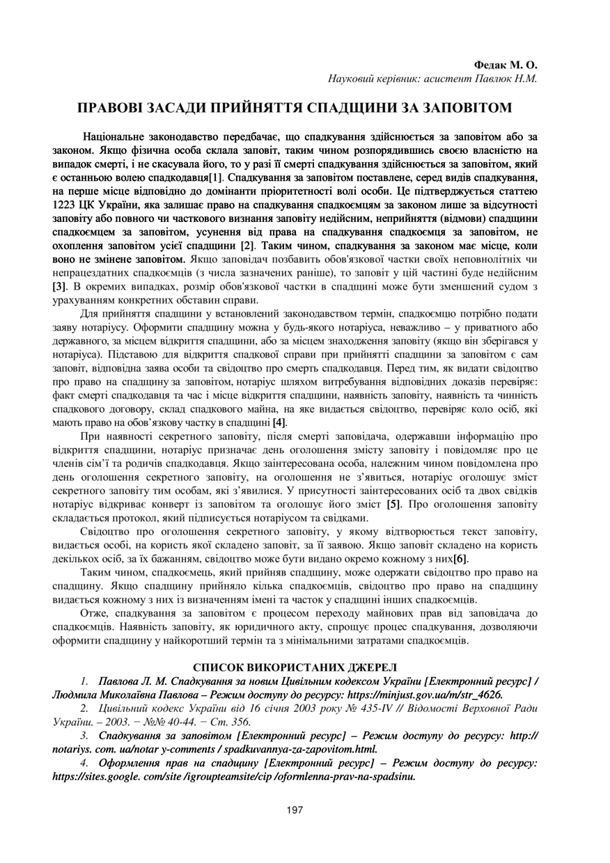 Федак М. О. Правові засади прийняття спадщини за заповітом / М. О. Федак, Н. М. Павлюк // 76-та Студентська науково-технічна конференція. Секція права та психології : збірник тез доповідей, 15–29 жовтня 2018 року, Львів. — Львів : Видавництво Львівської політехніки, 2018. — С. 197–198. — (Цивільногого права та процесу).