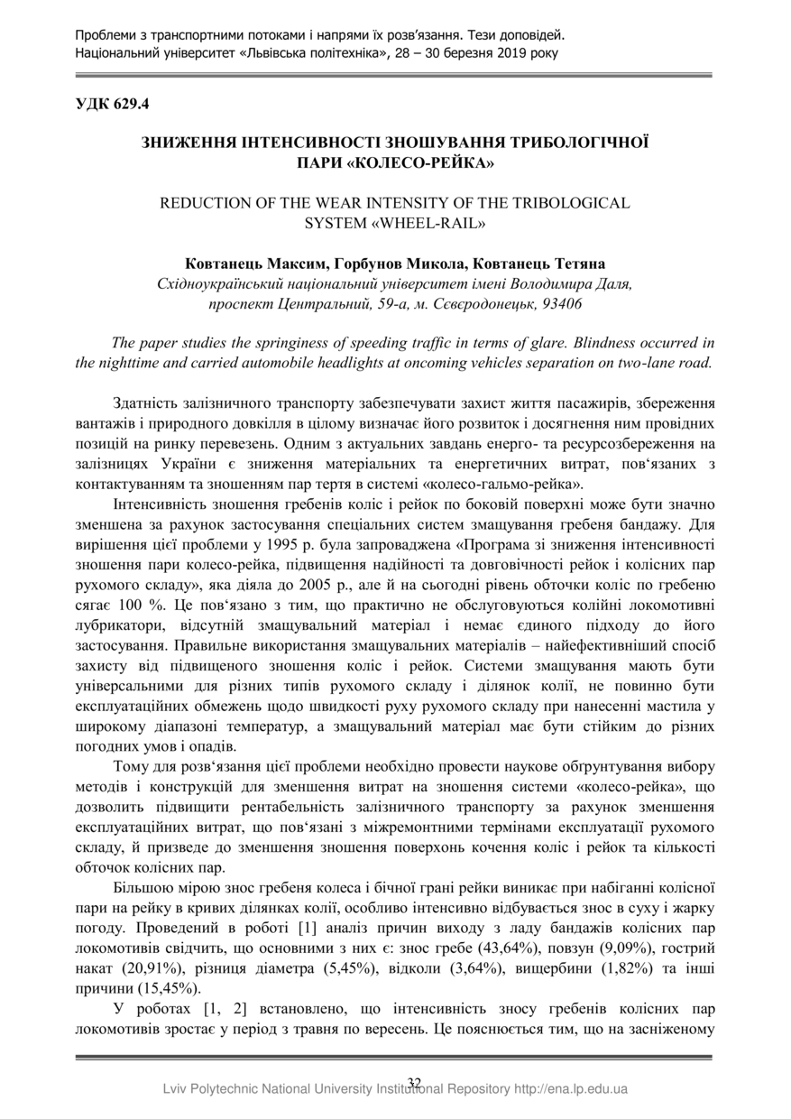 | dc.identifier.citationen | Kovtanets M. Reduction of the wear intensity of the tribological system «wheel-rail» / Maksim Kovtanets, Mikola Horbunov, Tetiana Kovtanets // Problemy z transportnymy potokamy i napriamy yikh rozviazannia : tezy dopovidei III Vseukrainskoi naukovo-teoretychnoi konferentsii, 28 – 30 bereznia 2019 roku, Lviv. — Posvit, 2019. — P. 32–33. — (Rozroblennia kompleksu tekhnichnykh zasobiv dlia rozvytku y efektyvnoho vykorystannia elementiv transportnykh system). | |