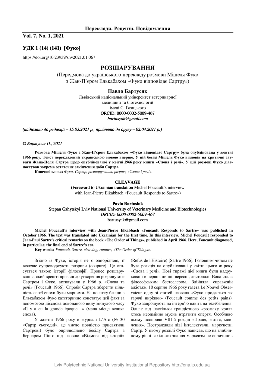 Bartusiak P. Cleavage (Foreword to Ukrainian Translation Michel Faucault’s Interview with Jean-Pierre Elkabbach «Foucault Responds to Sartre») / Pavlo Bartusiak // Humanitarian Vision. — Lviv : Lviv Politechnic Publishing House, 2021. — Vol 7. — No 1. — P. 67–68.