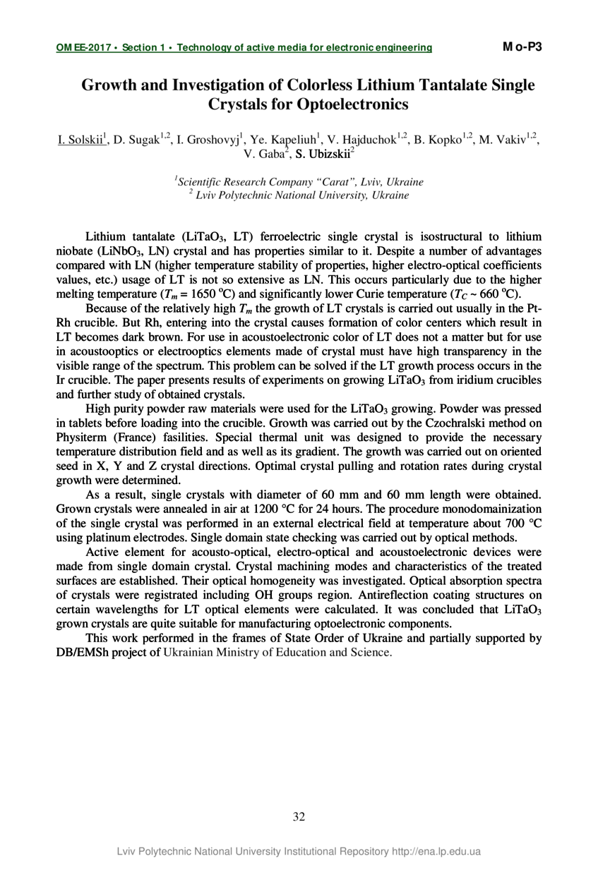 Growth and Investigation of Colorless Lithium Tantalate Single Crystals for Optoelectronics / I. Solskii, D. Sugak, I. Groshovyj, Ye. Kapeliuh, V. Hajduchok, B. Kopko, M. Vakiv, V. Gaba, S. Ubizskii // Oxide Materials