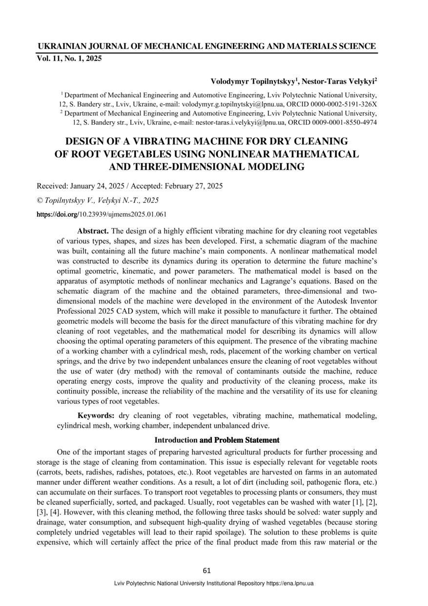 Topilnytskyy V. Design of a vibrating machine for dry cleaning of root vegetables using nonlinear mathematical and three-dimensional modeling / Volodymyr Topilnytskyy, Nestor-Taras Velykyi // Ukrainian Journal of Mechanical Engineering and Materials Science. — Lviv : Lviv Politechnic Publishing House, 2025. — Vol 11. — No 1. — P. 61–68.