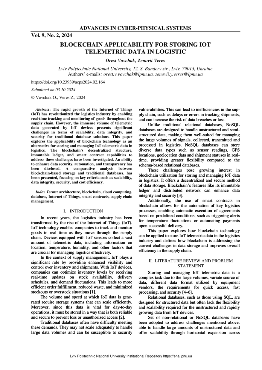 | dc.description.abstract | The rapid growth of the Internet of Things (IoT) has revolutionized the logistics industry by enabling real-time tracking and monitoring of goods throughout the supply chain. However, the immense volume of telemetric data generated by IoT devices presents significant challenges in terms of scalability, data integrity, and security for traditional database solutions. This paper explores the applicability of blockchain technology as an alternative for storing and managing IoT telemetric data in logistics. The blockchain’s decentralized structure, immutable ledger, and smart contract capabilities to address these challenges have been investigated. An ability to enhance data security, automation, and transparency has been disclosed.A comparative analysis between blockchain-based storage and traditional databases, has benn presented, focusing on key criteria such as scalability, data integrity, security, and cost efficiency. | |