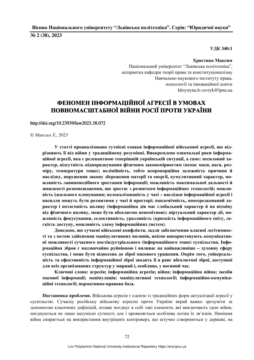 Максим Х. Феномен інформаційної агресії в умовах повномасштабної війни росії проти України / Христина Максим // Вісник Національного університету “Львівська політехніка”. Серія: “Юридичні науки”. — Львів : Видавництво Львівської політехніки, 2023. — № 2 (38). — С. 72–78.