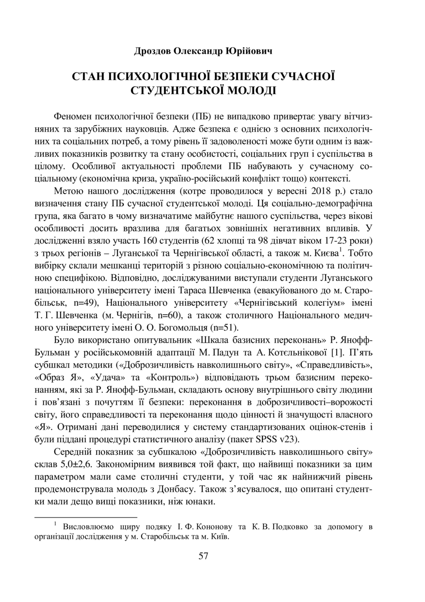 Дроздов О. Ю. Стан психологічної безпеки сучасної студентської молоді / Олександр Юрійович Дроздов // Психологія національної безпеки і благополуччя особистості : тези І Міжнародної науково-практичної конференції, 14–15 березня 2019 року, Львів. — Львів : Видавництво Львівської політехніки, 2019. — С. 57–58.