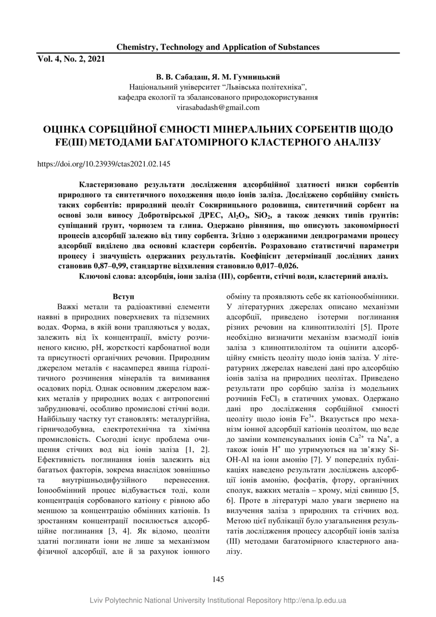 Сабадаш В. В. Оцінка сорбційної ємності мінеральних сорбентів щодо Fe(III) методами багатомірного кластерного аналізу / В. В. Сабадаш, Я. М. Гумницький // Chemistry, Technology and Application of Substances. — Lviv : Lviv Politechnic Publishing House, 2021. — Том 4. — № 2. — С. 145–150.