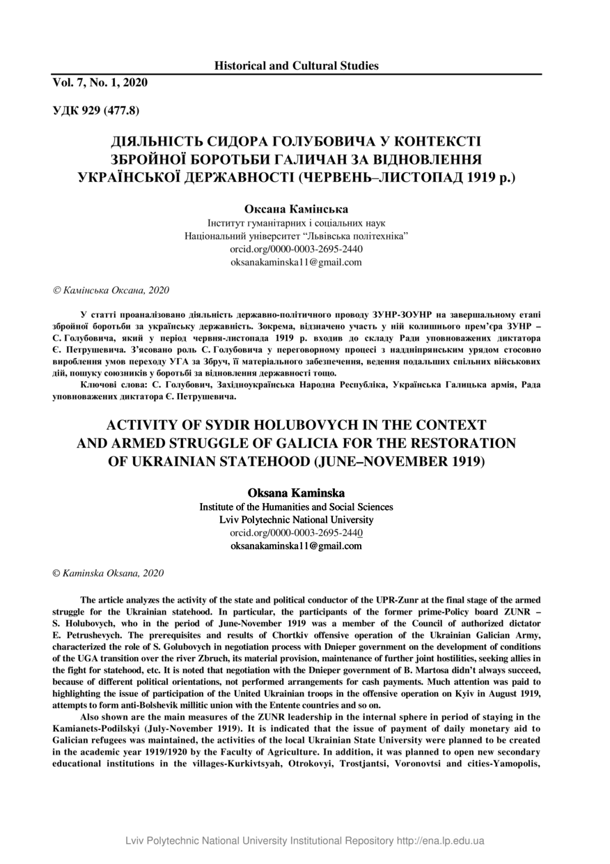 The article analyzes the activity of the state and political conductor of the UPR-Zunr at the final stage of the armed struggle for the Ukrainian statehood. In particular, the participants of the former prime-Policy board ZUNR – S. Holubovych, who in the period of June-November 1919 was a member of the Council of authorized dictator E. Petrushevych. The prerequisites and results of Chortkiv offensive operation of the Ukrainian Galician Army, characterized the role of S. Golubovych in negotiation process with Dnieper government on the development of conditions of the UGA transition over the river Zbruch, its material provision, maintenance of further joint hostilities, seeking allies in the fight for statehood, etc. It is noted that negotiation with the Dnieper government of B. Martosa didn’t always succeed, because of different political orientations, not performed arrangements for cash payments. Much attention was paid to highlighting the issue of participation of the United Ukrainian troops in the offensive operation on Kyiv in August 1919, attempts to form anti-Bolshevik millitic union with the Entente countries and so on. Also shown are the main measures of the ZUNR leadership in the internal sphere in period of staying in the Kamianets-Podilskyi (July-November 1919). It is indicated that the issue of payment of daily monetary aid to Galician refugees was maintained, the activities of the local Ukrainian State University were planned to be created in the academic year 1919/1920 by the Faculty of Agriculture. In addition, it was planned to open new secondary educational institutions in the villages-Kurkivtsyah, Otrokovyi, Trostjantsi, Voronovtsi and cities-Yamopolis, Balta, China-gorod, Chernyatyn. For the training of teachers in Podolia took measures to open in the Kamianets- Podilsky teacher Institute and five seminaries and more.
