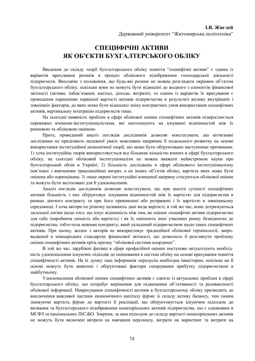 Жиглей І. В. Специфічні активи як об’єкти бухгалтерського обліку / І. В. Жиглей // Обліково-аналітичне забезпечення системи менеджменту підприємства : матеріали IV Міжнародної науково-практичної конференції, 24-26 жовтня 2019 року, Львів. — Львів : Видавництво Львівської політехніки, 2019. — С. 74–75.