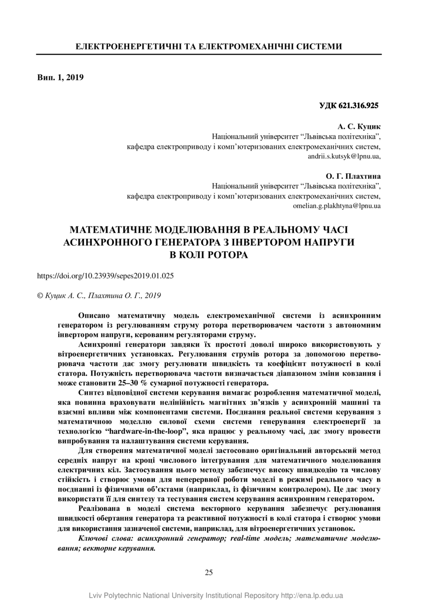Куцик А. С. Математичне моделювання в реальному часі асинхронного генератора з інвертором напруги в колі ротора / А. С. Куцик, О. Г. Плахтина // Електроенергетичні та електромеханічні системи. — Львів : Видавництво Львівської політехніки, 2019. — Том 1. — № 1. — С. 25–35.