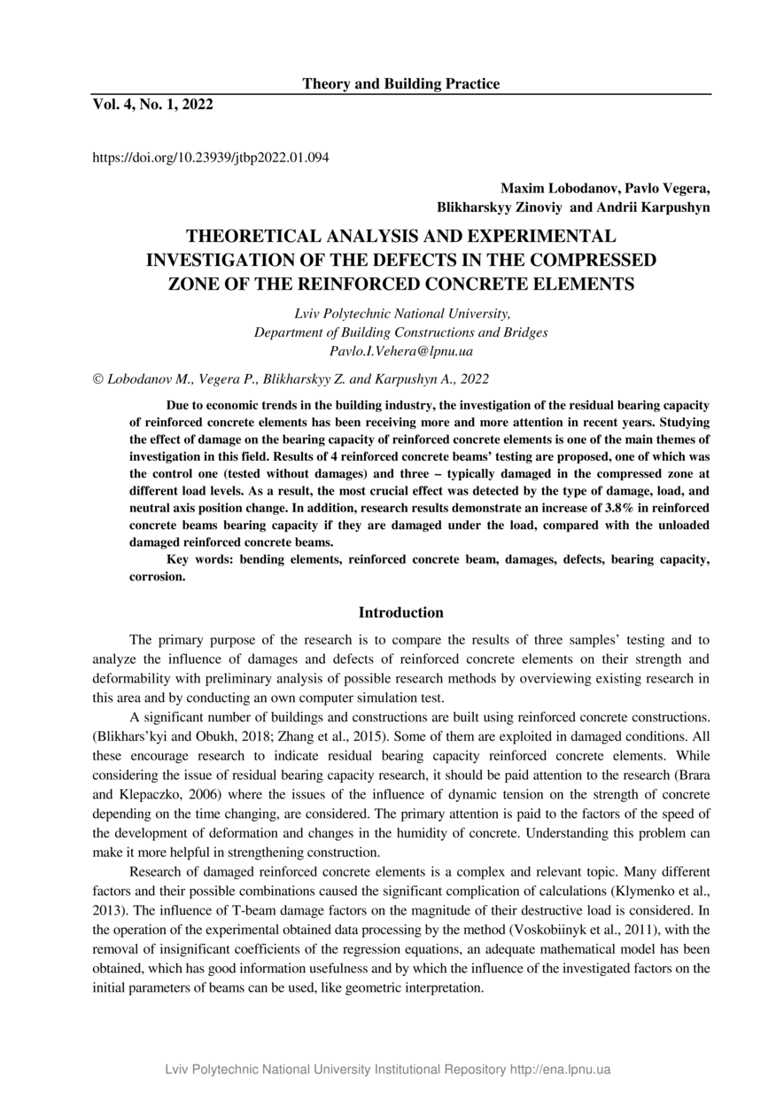 | dc.identifier.citation | Theoretical analysis and experimental investigation of the defects in the compressed zone of the reinforced concrete elements / Maxim Lobodanov, Pavlo Vegera, Blikharskyy Zinoviy, Andrii Karpushyn // Theory and Building Practice. — Lviv : Lviv Politechnic Publishing House, 2022. — Vol 4. — No 1. — P. 94–102. | |