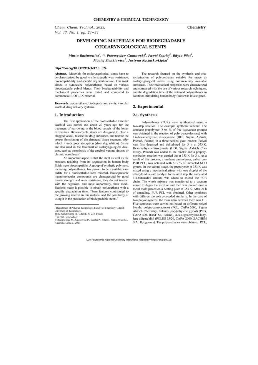 Developing Materials for Biodegradable Otolaryngological Stents / Marta Razimowicz, Przemysław Gnatowski, Paweł Szarlej, Edyta Piłat, Maciej Sienkiewicz, Justyna Kucińska-Lipka // Chemistry & Chemical Technology. — Lviv : Lviv Politechnic Publishing House, 2023. — Vol 17. — No 1. — P. 24–34.