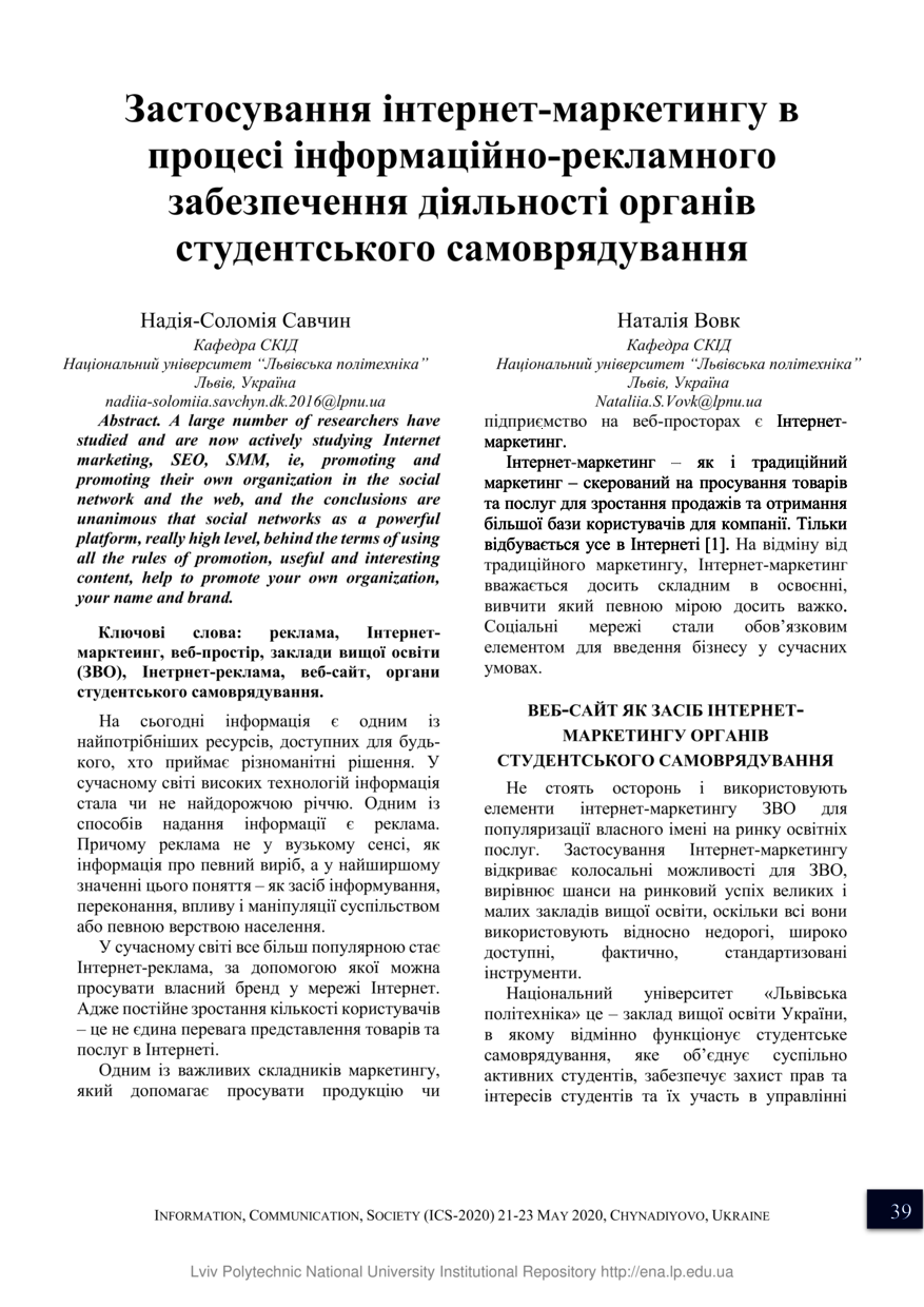 Савчин Н. Застосування інтернет-маркетингу в процесі інформаційно-рекламного забезпечення діяльності органів студентського самоврядування / Надія-Соломія Савчин, Наталія Вовк // Інформація, комунікація, суспільство 2020 : матеріали 9-ї Міжнародної наукової конференції, 21–23 травня 2020 року, Львів. — Львів : Видавництво Львівської політехніки, 2020. — С. 39–40. — (Інформаційні та комунікаційні технології в Internet та World Wide Web).