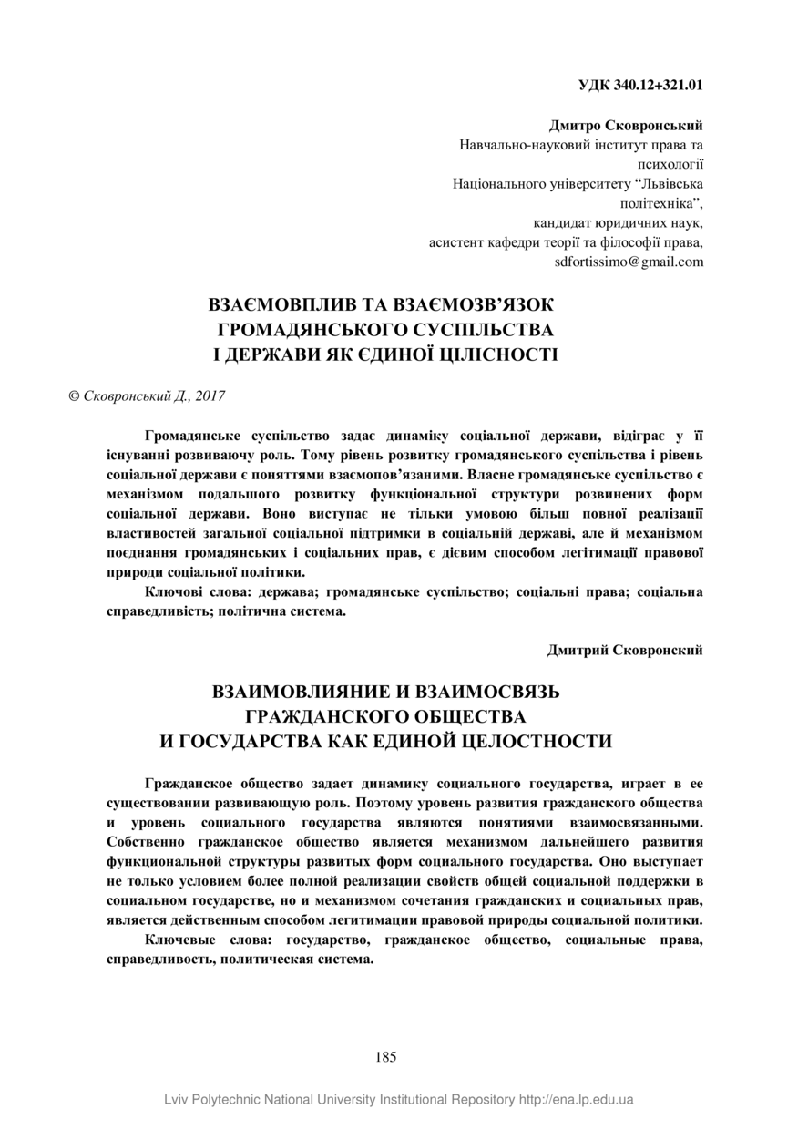 Сковронський Д. Взаємовплив та взаємозв’язок громадянського суспільства і держави як єдиної цілісності / Дмитро Сковронський // Вісник Національного університету «Львівська політехніка». Серія: Юридичні науки : збірник наукових праць. — Львів : Видавництво Львівської політехніки, 2017. — № 861. — С. 185–192.