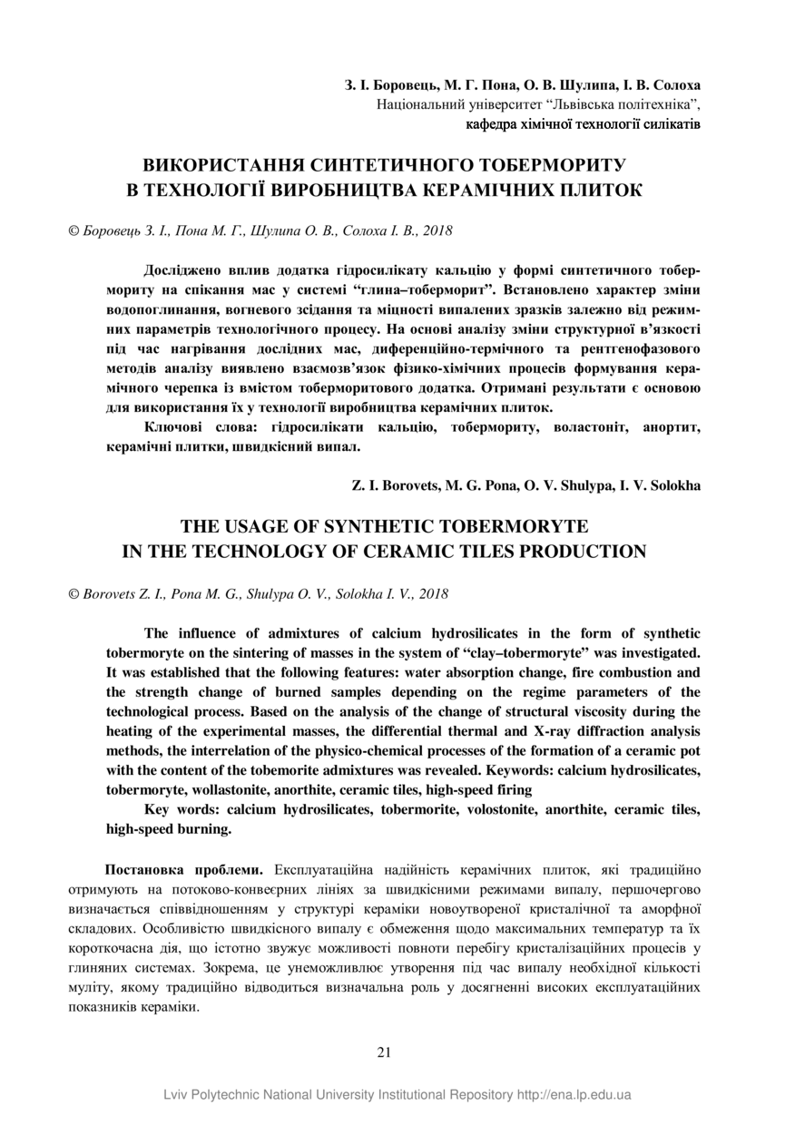 | dc.title | Використання синтетичного тобермориту в технології виробництва керамічних плиток | |