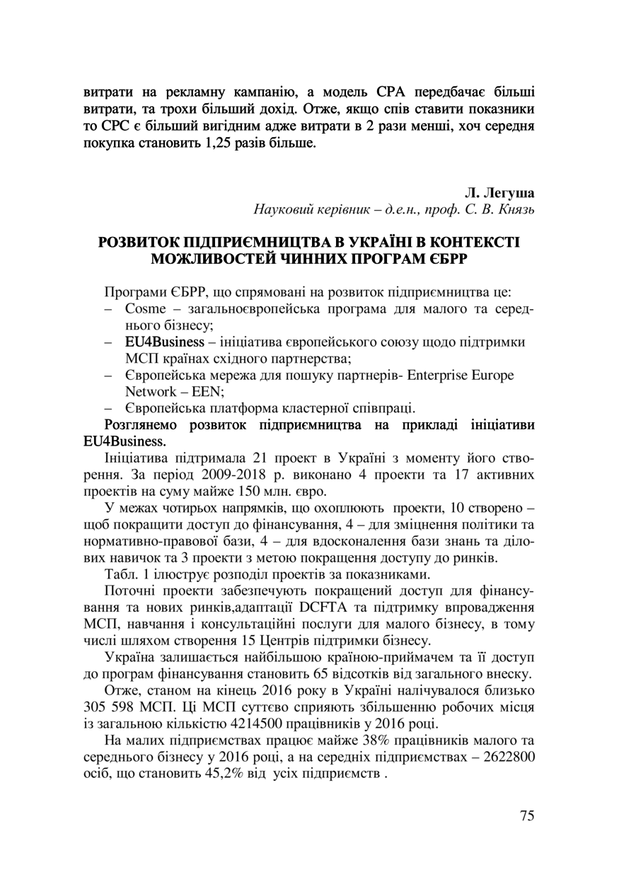 Легуша Л. Розвиток підприємництва в Україні в контексті можливостей чинних програм ЄБРР / Л. Легуша, С. В. Князь // 77-ма Студентська науково-технічна конференція : збірник тез доповідей, жовтень, Львів. — Львів : Видавництво Львівської політехніки, 2019. — С. 75–76. — (Секція екології, природоохоронної діяльності і туризму).