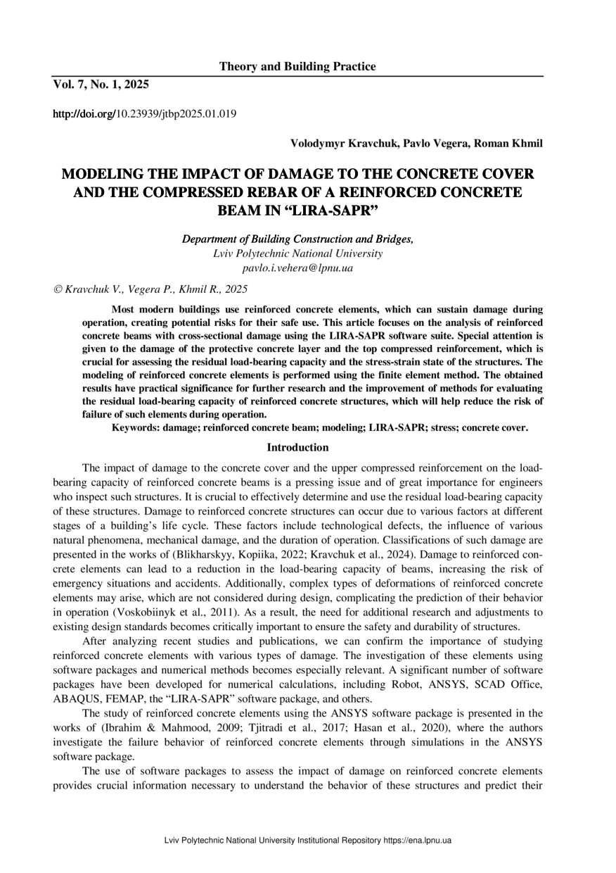 Kravchuk V. Modeling the impact of damage to the concrete cover and the compressed rebar of a reinforced concrete beam in “LIRA-SAPR” / Volodymyr Kravchuk, Pavlo Vegera, Roman Khmil // Theory and Building Practice. — Lviv : Lviv Politechnic Publishing House, 2025. — Vol 7. — No 1. — P. 19–30.
