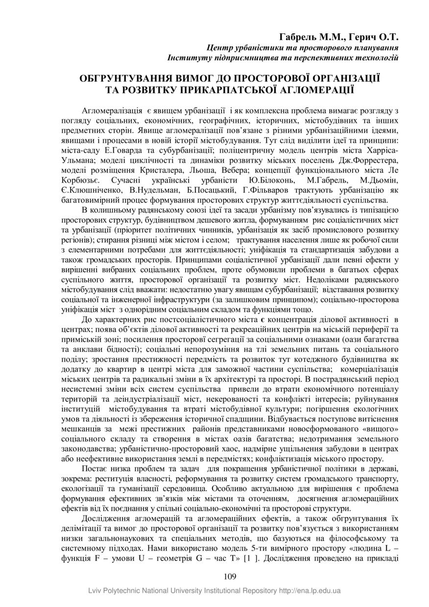 Габрель М. М. Обгрунтування вимог до просторової організації та розвитку Прикарпатської агломерації / М. М. Габрель, О. Т. Герич // Проблеми та перспективи розвитку економіки і підприємництва та комп’ютерних технологій в Україні : збірник тез доповідей ХIV Науково-практичної конференції, 17-20 квітня 2018 року. — Львів : Видавництво Львівської політехніки, 2018. — С. 109–111. — (Актуальні проблеми економіки та маркетингу України).