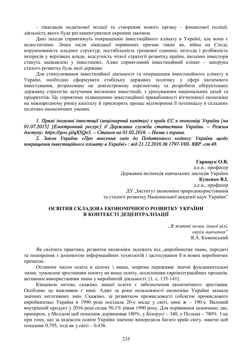 Гаращук О. В. Освітня складова економічного розвитку України в контексті децентралізації / О. В. Гаращук, В. І. Куценко // Економічний розвиток держави, регіонів і підприємств: проблеми та перспективи : матеріали ІІ Міжнародної науково-практичної конференції молодих учених, 18–19 травня 2017 року, Львів. — Львів : Видавництво Львівської політехніки, 2017. — С. 235–237. — (Збалансований розвиток економіки України: соціально-правовий, екологічний та інші аспекти).