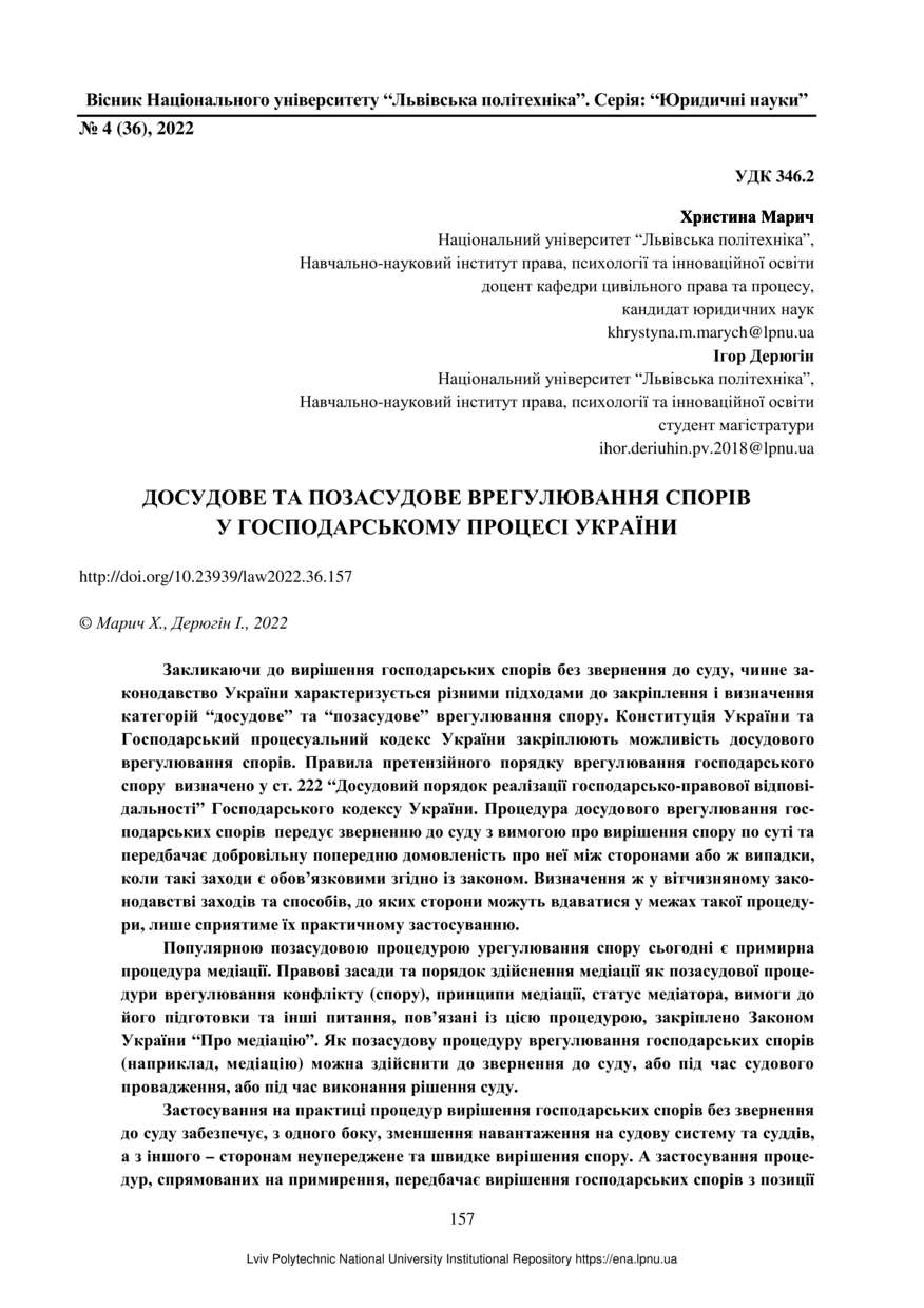 | dc.identifier.citation | Марич Х. Досудове та позасудове врегулювання спорів у господарському процесі України / Христина Марич, Ігор Дерюгін // Вісник Національного університету “Львівська політехніка”. Серія: Юридичні науки. — Львів : Видавництво Львівської політехніки, 2022. — № 4 (36). — С. 157–163. | |