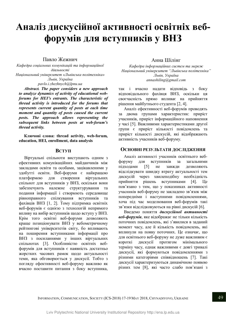 Жежнич П. Аналіз дискусійної активності освітніх веб-форумів для вступників у ВНЗ / Павло Жежнич, Анна Шілінг // Інформація, комунікація, суспільство : матеріали 7-ї Міжнародної наукової конференції, 17–19 травня 2018 року, Чинадієво. — Львів : Видавництво Львівської політехніки, 2018. — С. 49–50. — (Інформаційні та комунікаційні технології в Internet та World Wide Web).