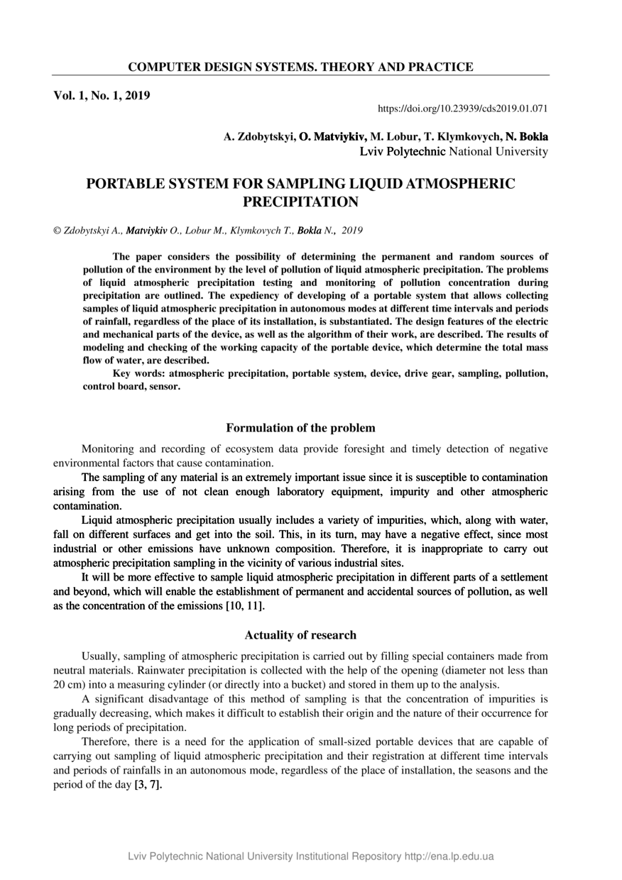 Portable system for sampling liquid atmospheric precipitation / A. Zdobytskyi, O. Matviykiv, M. Lobur, T. Klymkovych, N. Bokla // Computer Design Systems. Theory and Practice. — Lviv : Lviv Politechnic Publishing House, 2019. — Vol 1. — No 1. — P. 71–78.