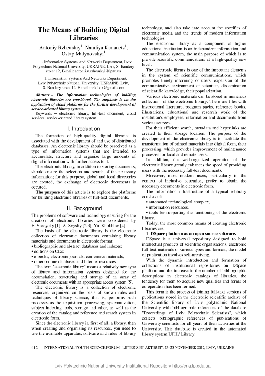 Rzheuskiy A. The means of building digital libraries / Antoniy Rzheuskiy, Nataliya Kunanets, Ostap Malynovskyi // Litteris et Artibus : proceedings, 23–25 November, 2017. — Lviv : Lviv Polytechnic Publishing House, 2017. — P. 412–413. — (9th International academic conference «Computer science & engineering 2017» (CSE-2017)).