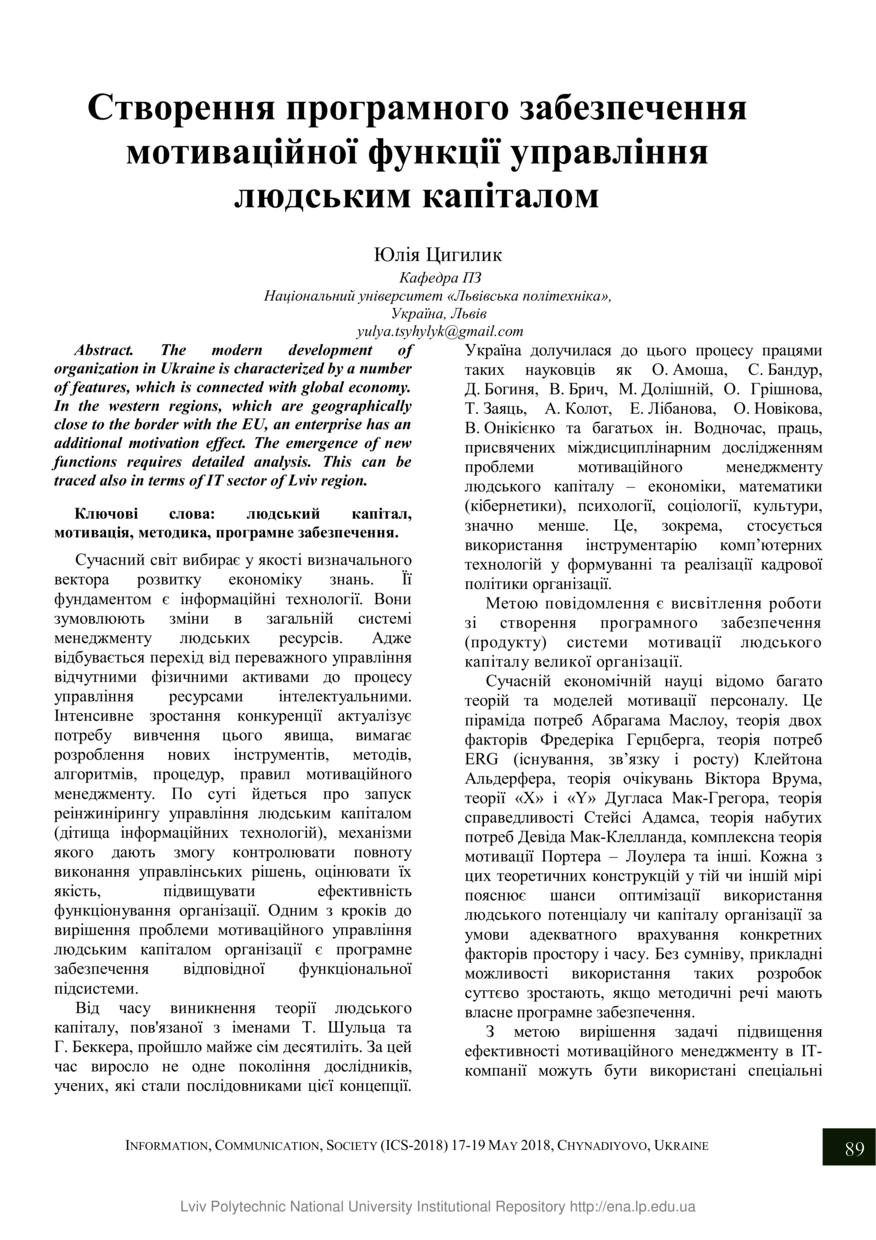 Цигилик Ю. Створення програмного забезпечення мотиваційної функції управління людським капіталом / Юлія Цигилик // Інформація, комунікація, суспільство : матеріали 7-ї Міжнародної наукової конференції, 17–19 травня 2018 року, Чинадієво. — Львів : Видавництво Львівської політехніки, 2018. — С. 89–90. — (Інформаційні та комунікаційні технології в Internet та World Wide Web).