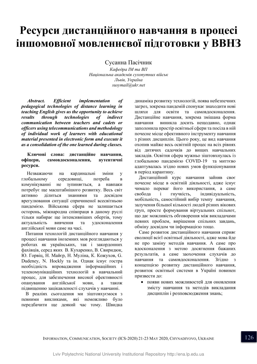 Пасічник С. Ресурси дистанційного навчання в процесі іншомовної мовленнєвої підготовки у ВВНЗ / Сусанна Пасічник // Інформація, комунікація, суспільство 2020 : матеріали 9-ї Міжнародної наукової конференції, 21–23 травня 2020 року, Львів. — Львів : Видавництво Львівської політехніки, 2020. — С. 126–127. — (Лінгвістичні технології інформаційної діяльності).