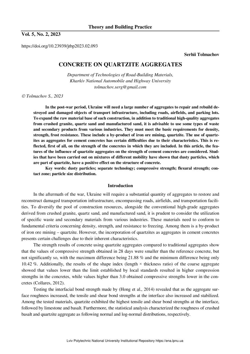 Tolmachov S. Concrete on quartzite aggregates / S. Tolmachov // Theory and Building Practice. — Lviv : Lviv Politechnic Publishing House, 2023. — Vol 5. — No 2. — P. 93–100.
