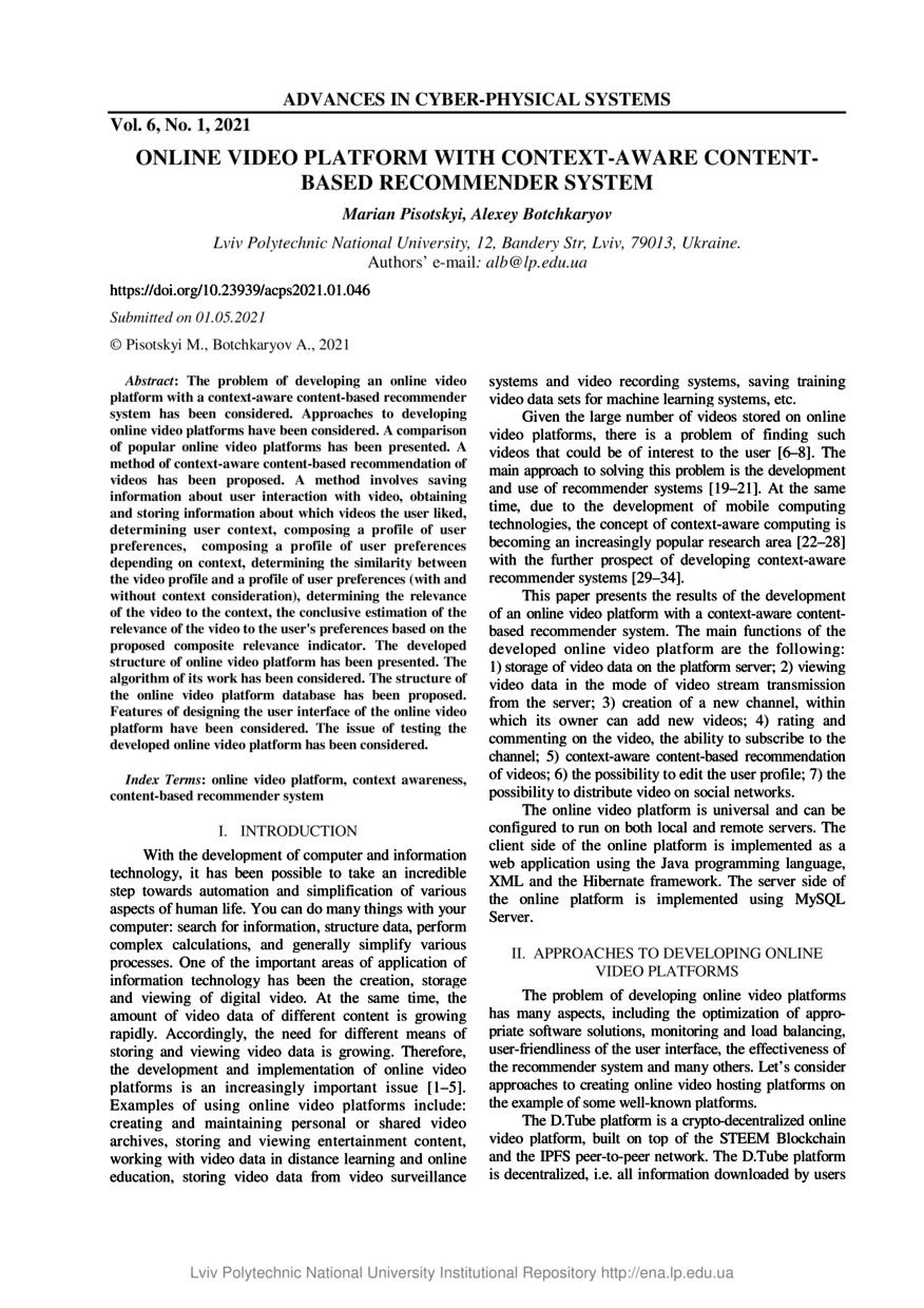 Pisotskyi M. Online Video Platform with Context-Aware Content-Based Recommender System / Marian Pisotskyi, Alexey Botchkaryov // Advances in Cyber-Physical Systems. — Lviv : Lviv Politechnic Publishing House, 2021. — Vol 6. — No 1. — P. 46–53.