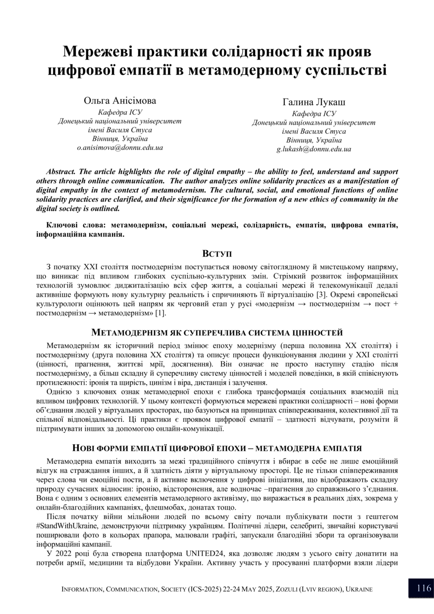 | dc.description.abstract | The article highlights the role of digital empathy – the ability to feel, understand and support others through online communication. The author analyzes online solidarity practices as a manifestation of digital empathy in the context of metamodernism. The cultural, social, and emotional functions of online solidarity practices are clarified, and their significance for the formation of a new ethics of community in the digital society is outlined. | |