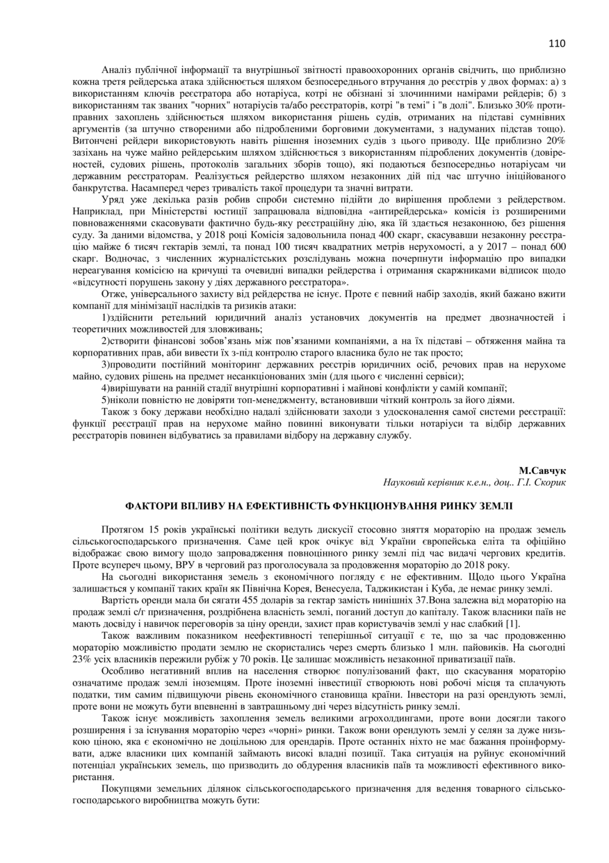 Савчук М. Фактори впливу на ефективність функціонування ринку землі / М. Савчук, Г. І. Скорик // 77-ма Студентська науково-технічна конференція. Секція "Публічне управління та адміністрування" : збірник тез доповідей, 7 листопада 2019 року, Львів. — Львів : Видавництво Львівської політехніки, 2019. — С. 110–111. — (Проблеми конкурентного регулювання).