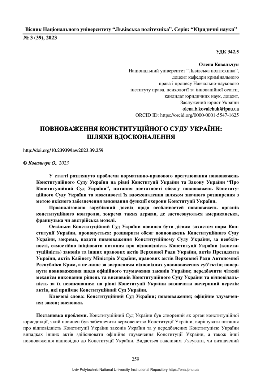 | dc.identifier.citation | Ковальчук О. Повноваження Конституційного Суду України: шляхи вдосконалення / Олена Ковальчук // Вісник Національного університету “Львівська політехніка”. Серія: “Юридичні науки”. — Львів : Видавництво Львівської політехніки, 2023. — № 3 (39). — С. 259–265. | |