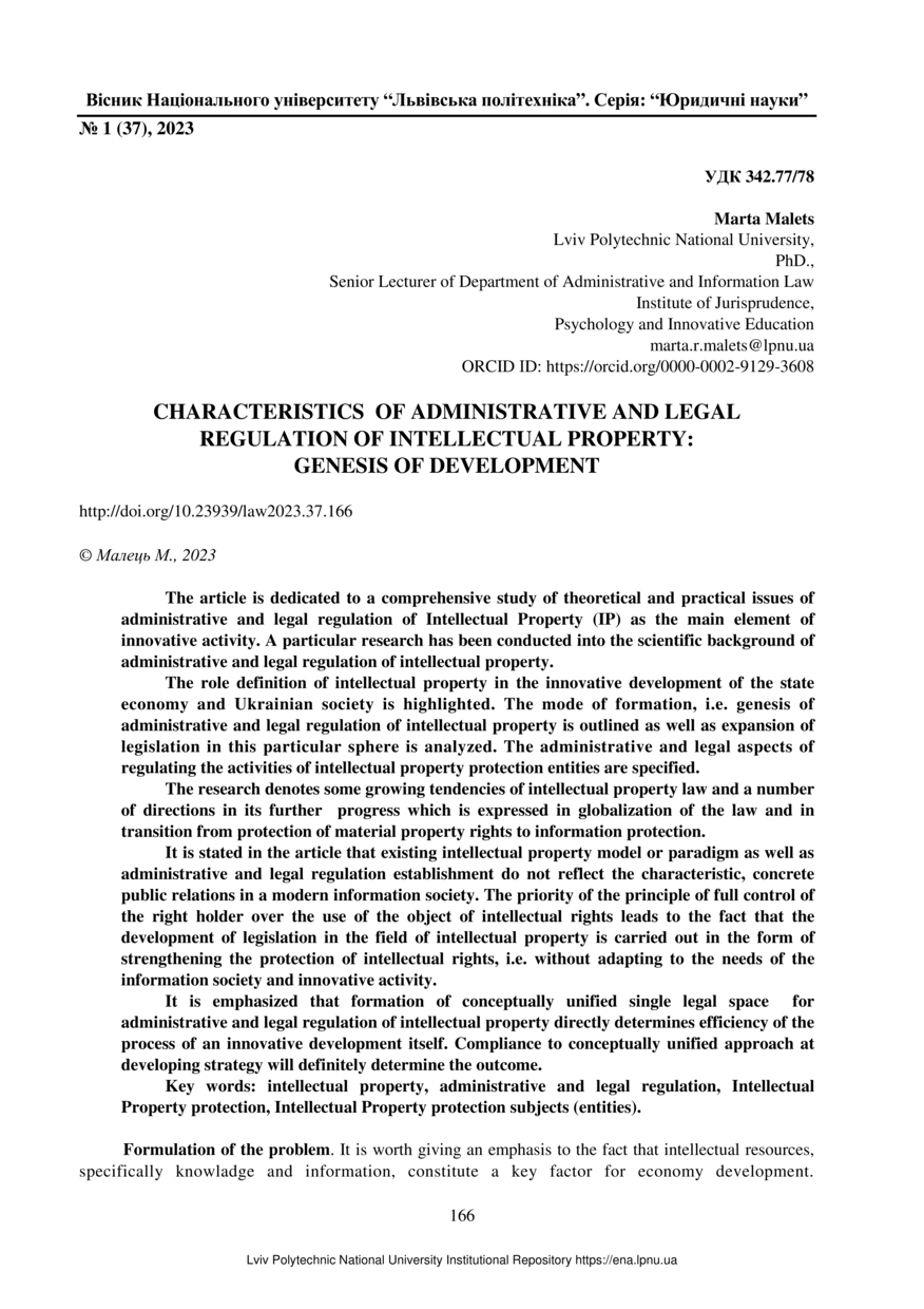 Malets M. Characteristics of administrative and legal regulation of intellectual property: genesis of development / Malets Marta // Вісник Національного університету “Львівська політехніка”. Серія: Юридичні науки. — Lviv : Lviv Politechnic Publishing House, 2023. — No 1(37). — P. 166–173.