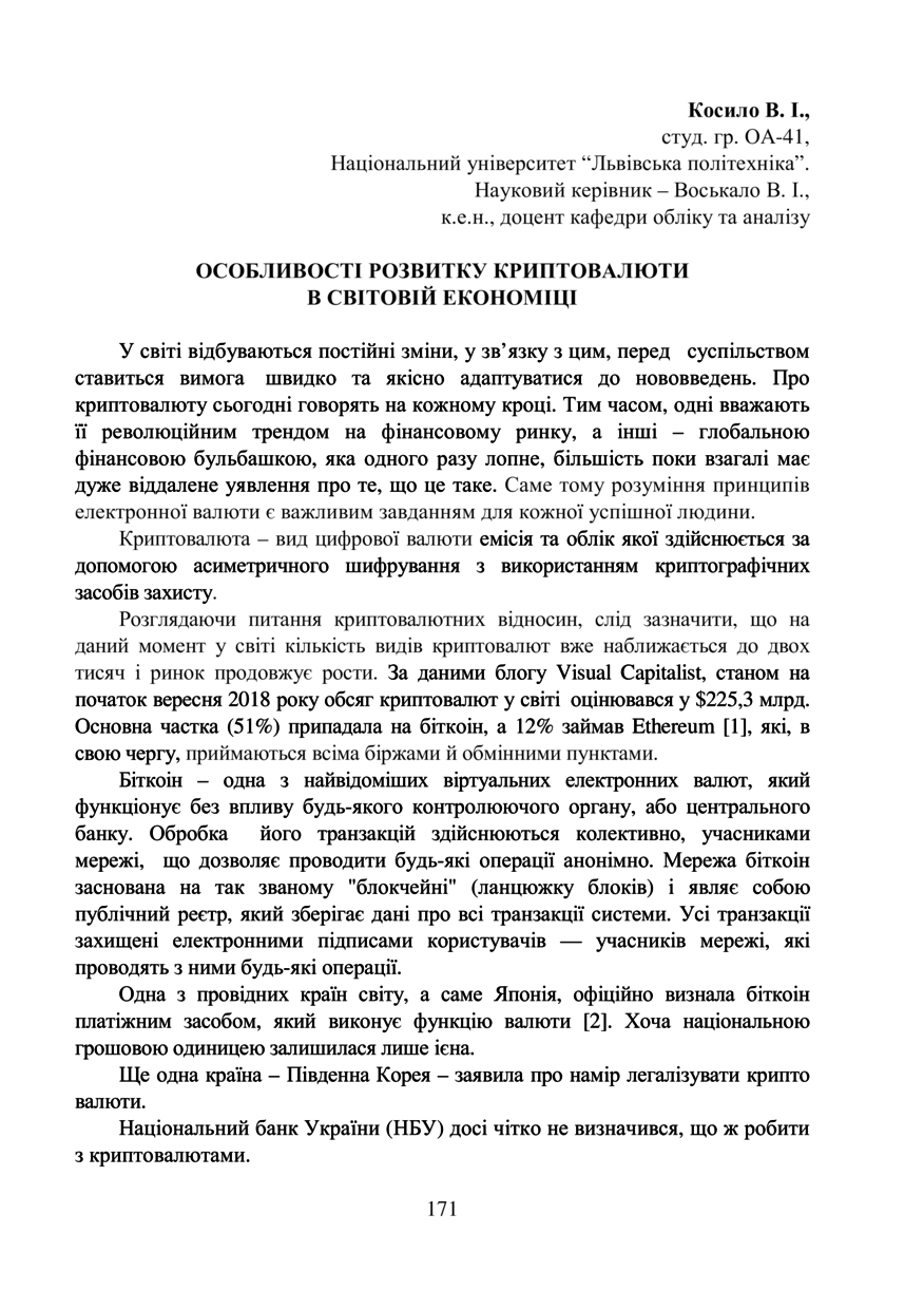 | dc.identifier.citation | Косило В. І. Особливості розвитку криптовалюти в світовій економіці / В. І. Косило, В. І. Воськало // Облік, аналіз і контроль в системі управління суб’єктами економіки : тези доповідей ІV Міжнародної студентської наукової конференції, 18–19 жовтня 2018 року, Львів. — Львів : Видавництво Львівської політехніки, 2018. — С. 171–173. — (Проблеми та перспективи використання інформаційних систем і технологій в обліку, аналізі та аудиті). | |