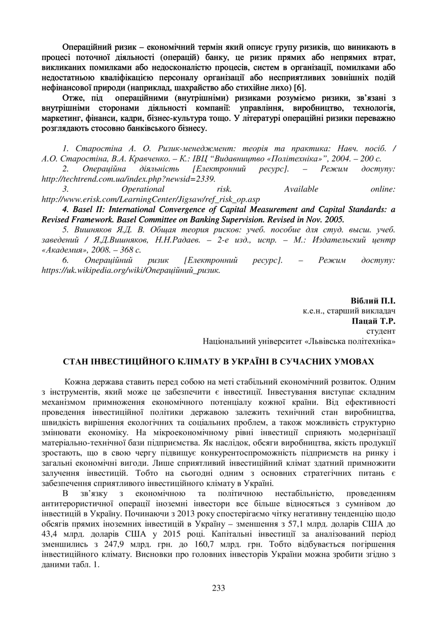 Віблий П. І. Стан інвестиційного клімату в україні в сучасних умовах / П. І. Віблий, Т. Р. Пацай // Економічний розвиток держави, регіонів і підприємств: проблеми та перспективи : матеріали ІІ Міжнародної науково-практичної конференції молодих учених, 18–19 травня 2017 року, Львів. — Львів : Видавництво Львівської політехніки, 2017. — С. 233–235. — (Збалансований розвиток економіки України: соціально-правовий, екологічний та інші аспекти).