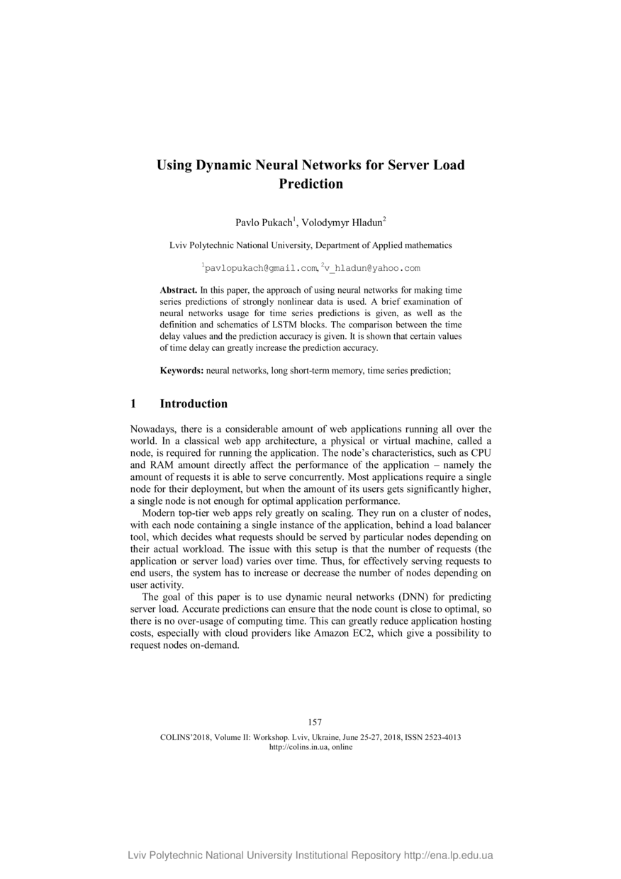 Pukach P. Using dynamic neural networks for server load prediction / Pavlo Pukach, Volodymyr Hladun // Computational linguistics and intelligent systems, 25-27 June 2018. — Lviv : Lviv Polytechnic National University, 2018. — Vol 2 : Workshop. — P. 157–160. — (Section II. Intelligent Systems).