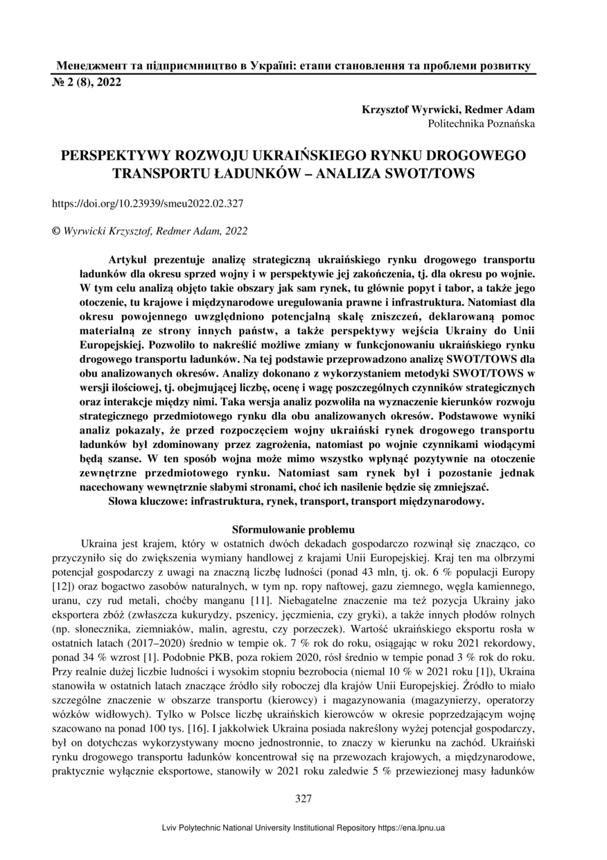 Wyrwicki K. Perspektywy rozwoju ukraińskiego rynku drogowego transport ładunków – analiza SWOT/TOWS / Krzysztof Wyrwicki, Redmer Adam // Менеджмент та підприємництво в Україні: етапи становлення і проблеми розвитку. — Львів : Видавництво Львівської політехніки, 2022. — Том 4. — № 2. — С. 327–343.