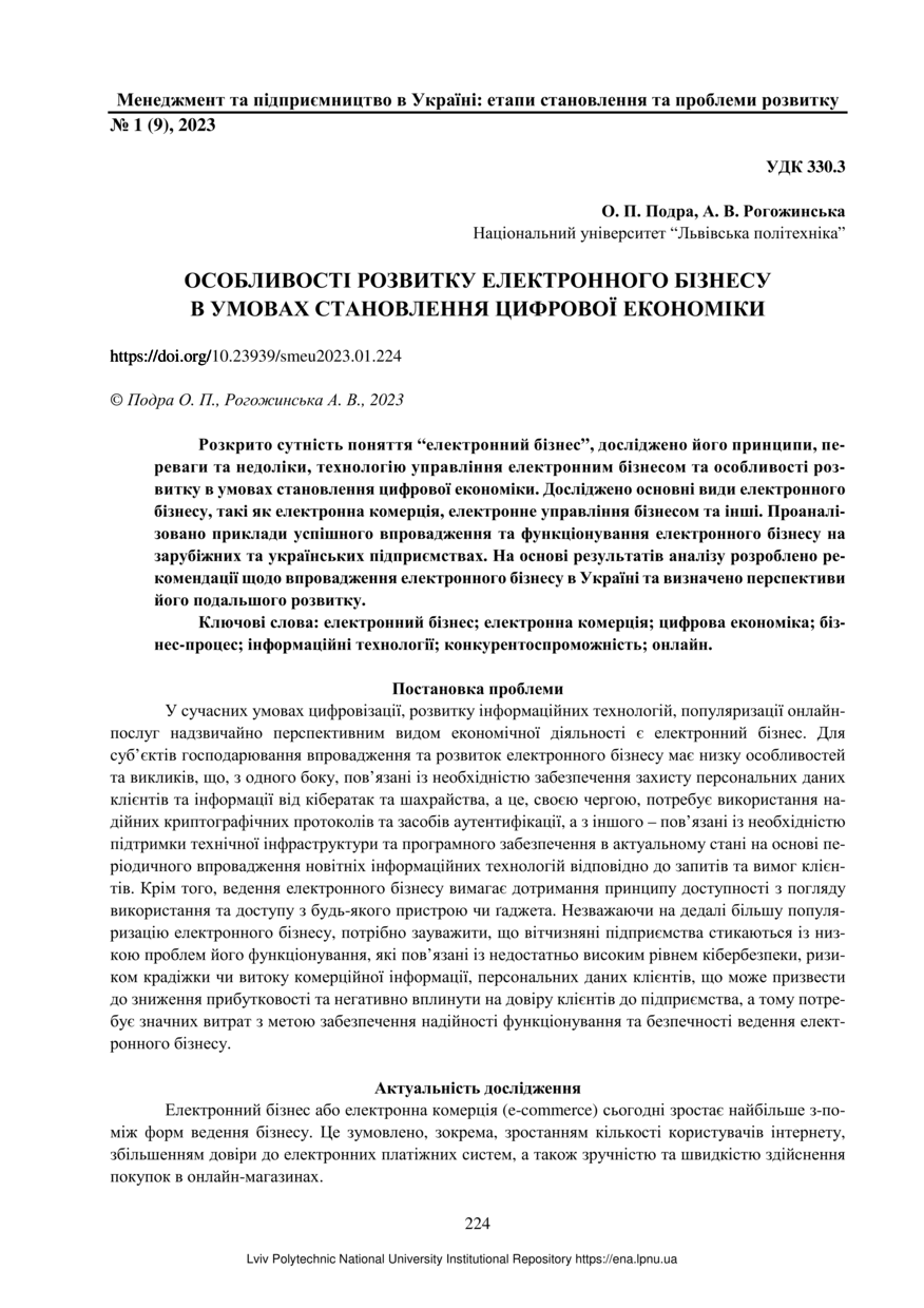 | dc.identifier.citationen | Podra O. P. Features of electronic business development under conditions of digital economy formation / O. P. Podra, A. V. Rohozhynska // Management and Entrepreneurship in Ukraine: the Stages of Formation and Problems of Development. — Lviv : Lviv Politechnic Publishing House, 2023. — Vol 5. — No 1. — P. 224–235. | |