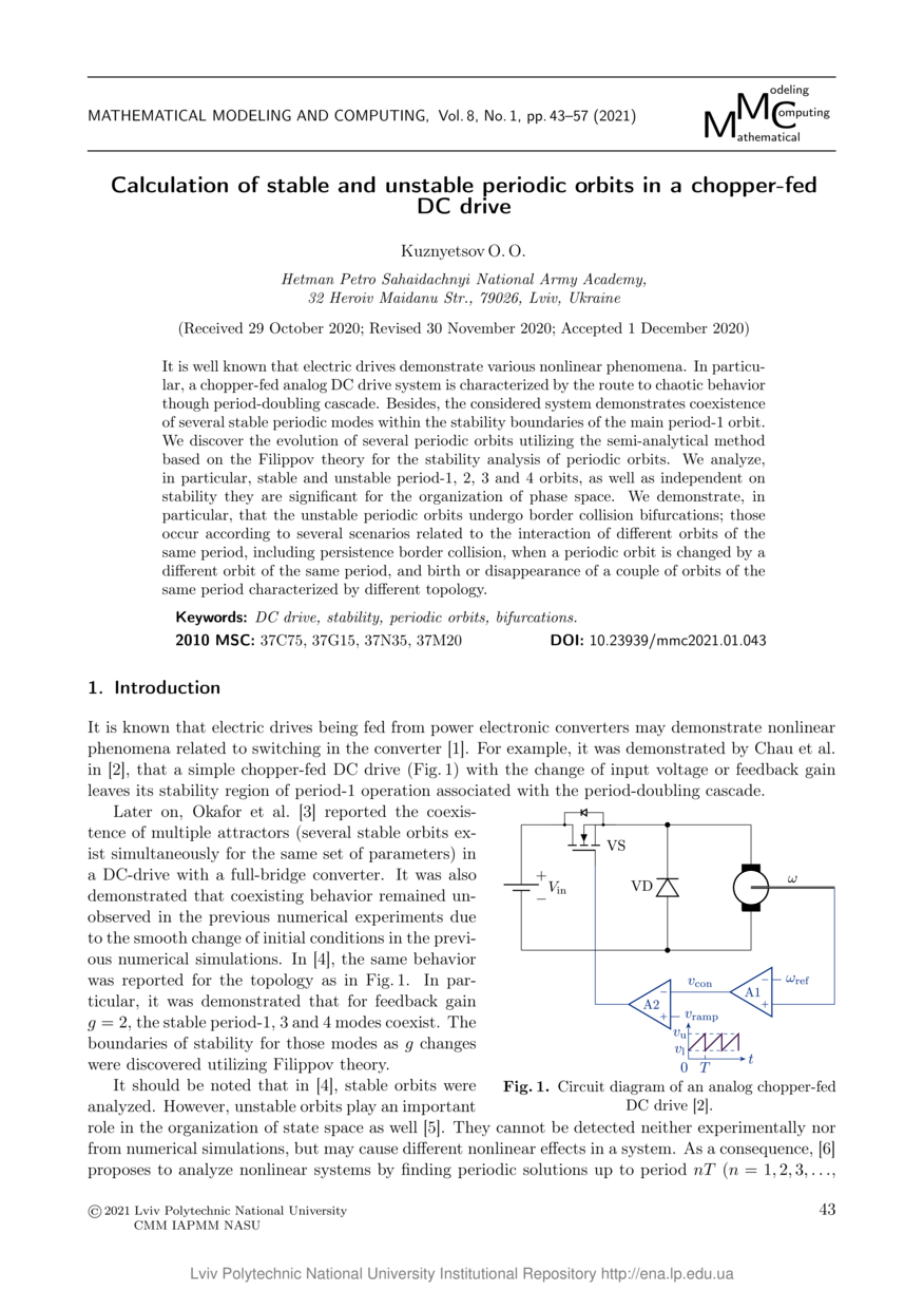 Kuznyetsov O. O. Calculation of stable and unstable periodic orbits in a chopper-fed DC drive / O. O. Kuznyetsov // Mathematical Modeling and Computing. — Lviv : Lviv Politechnic Publishing House, 2021. — Vol 8. — No 1. — P. 43–57.