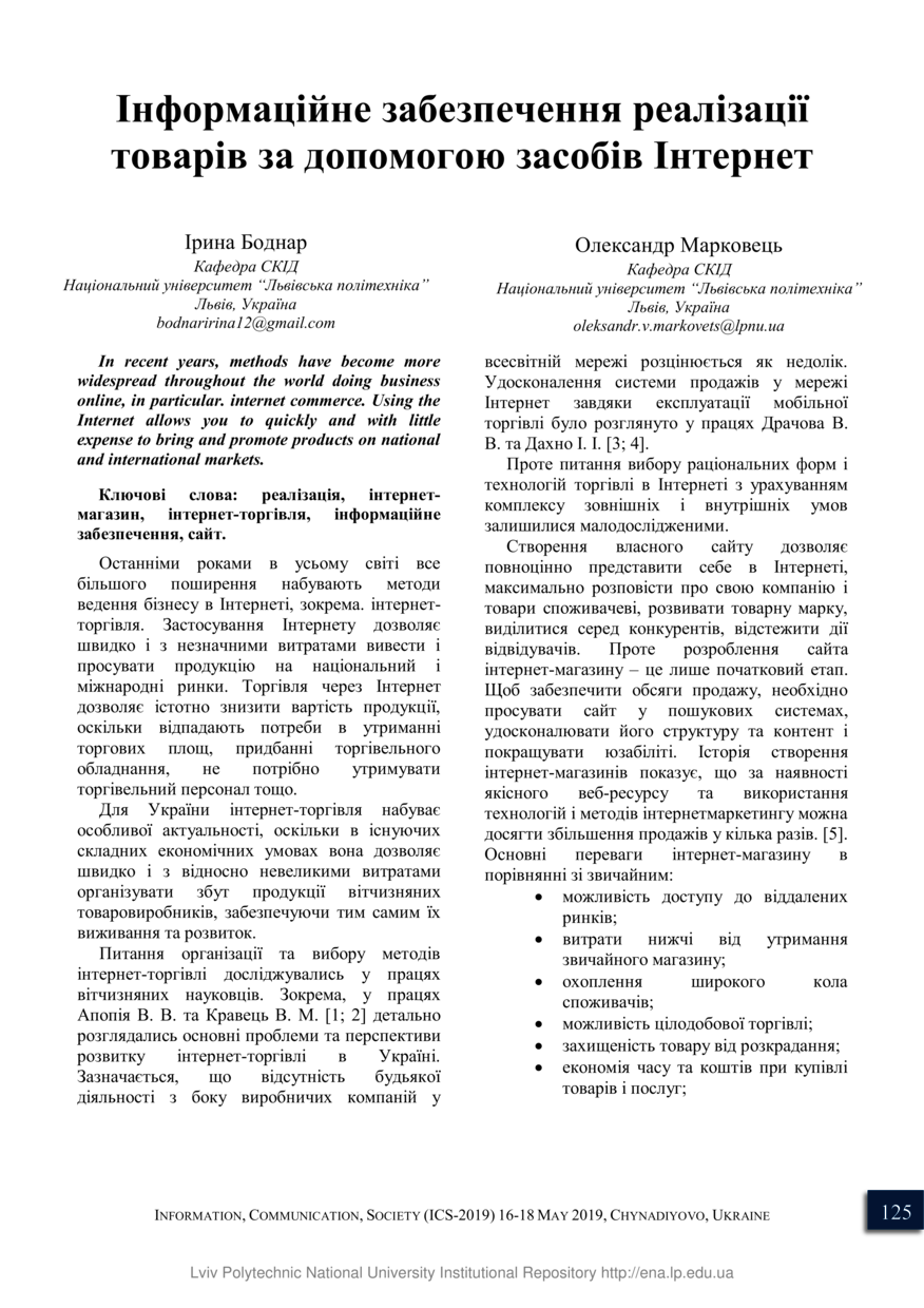 Боднар І. Інформаційне забезпечення реалізації товарів за допомогою засобів Інтернет / Ірина Боднар, Олександр Марковець // Інформація, комунікація, суспільство 2019 : матеріали 8-ої Міжнародної наукової конференції ІКС-2019, 16-18 травня 2019 року, Чинадієво. — Львів : Видавництво Львівської політехніки, 2019. — С. 125–126. — (Бібліотечна, архівна та музейна діяльність в умовах розвитку інформаційного суспільства).