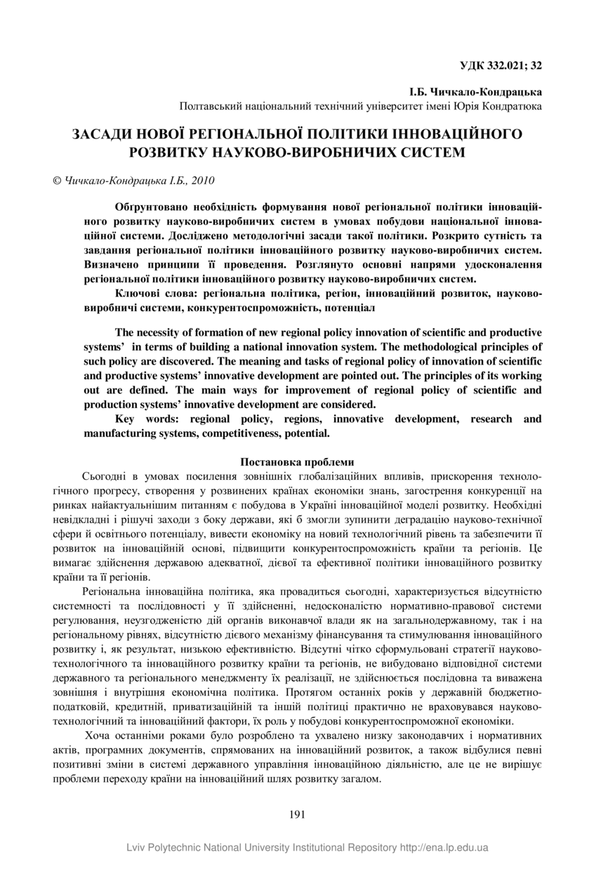 | dc.identifier.citationen | Chychkalo-Kondratska I. B. Zasady novoi rehionalnoi polityky innovatsiinoho rozvytku naukovo-vyrobnychykh system / I. B. Chychkalo-Kondratska // Visnyk Natsionalnoho universytetu "Lvivska politekhnika". — Vydavnytstvo Lvivskoi politekhniky, 2010. — No 668 : Problemy ekonomiky ta upravlinnia. — P. 191–197. | |