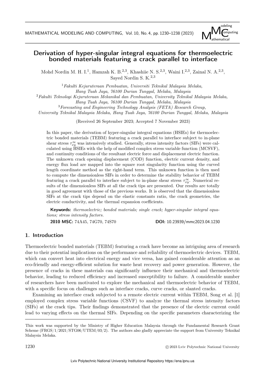 Derivation of hyper-singular integral equations for thermoelectric bonded materials featuring a crack parallel to interface / M. H. I. Mohd Nordin, K. B. Hamzah, N. S. Khashiie, I. Waini, N. A. Zainal, S. K. Sayed Nordin // Mathematical Modeling and Computing. — Lviv Politechnic Publishing House, 2023. — Vol 10. — No 4. — P. 1230–1238.
