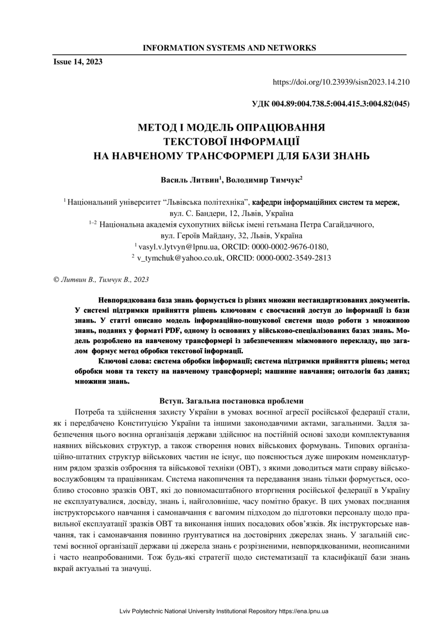Литвин В. Метод і модель опрацювання текстової інформації на навченому трансформері для бази знань / Василь Литвин, Володимир Тимчук // Вісник Національного університету “Львівська політехніка”. Серія: Інформаційні системи та мережі. — Львів : Видавництво Львівської політехніки, 2023. — № 14. — С. 210–224.