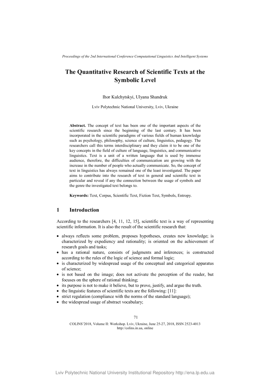 Kulchytskyi I. The uantitative research of scientific texts at the symbolic level / Ihor Kulchytskyi, Ulyana Shandruk // Computational linguistics and intelligent systems, 25-27 June 2018. — Lviv : Lviv Polytechnic National University, 2018. — Vol 2 : Workshop. — P. 71–80. — (Part 1. Keynote speakers talks).