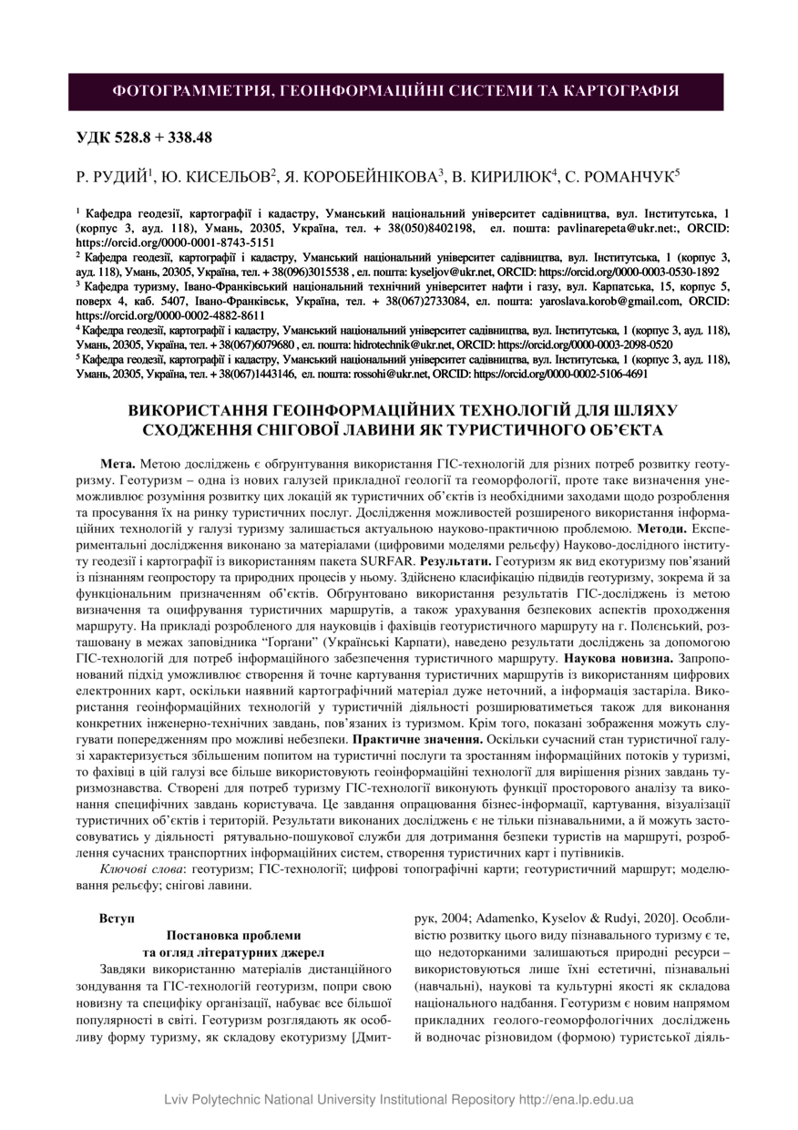 Використання геоінформаційних технологій для шляху сходження снігової лавини як туристичного об’єкта / Р. Рудий, Ю. Кисельов, Я. Коробейнікова, В. Кирилюк, С. Романчук // Сучасні досягнення геодезичної науки та виробництва. — Львів : Видавництво Львівської політехніки, 2021. — Том ІІ (42). — С. 76–83.