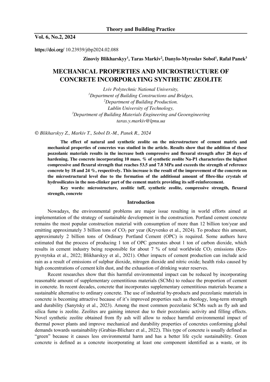 Mechanical properties and microstructure of concrete incorporating synthetic zeolite / Zinoviy Blikharskyy, Taras Markiv, Danylo-Myroslav Sobol, Rafał Panek // Theory and Building Practice. — Lviv : Lviv Politechnic Publishing House, 2024. — Vol 6. — No 2. — P. 88–95.
